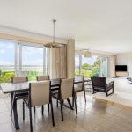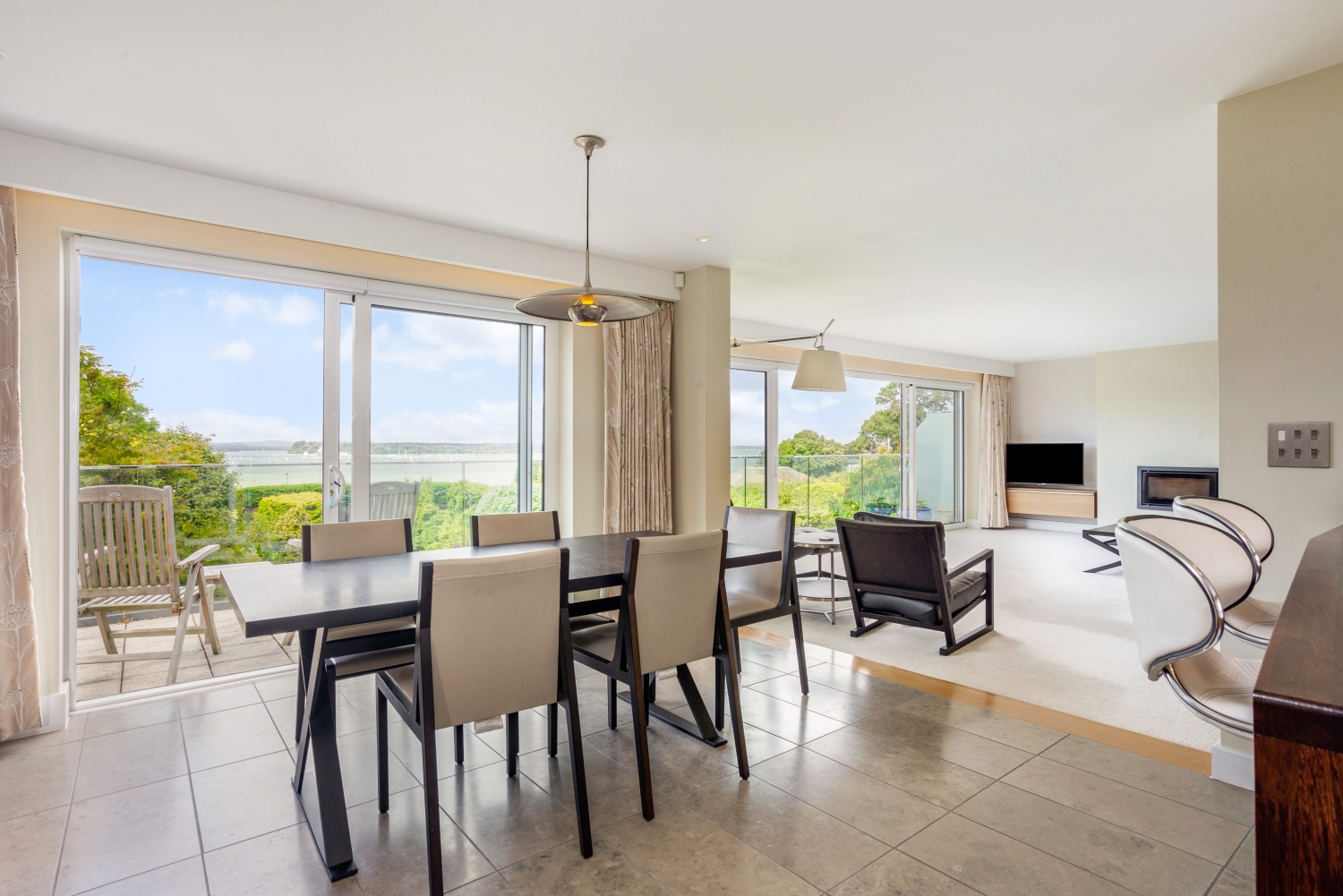 Open plan living area for dining, lounge and kitchen with patio doors leading to a balcony to enjoy the views.
