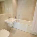 Bathroom: Roca Basin taps, bath with shower handset attachment, Porcelenosa tiling, chrome towel rail and underfloor heating.