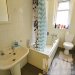 Communal bathroom with shower over bath.