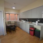 Share of open-plan fitted kitchen with allocated cupboards and dining room.