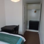 The bedroom is fully furnished with bed, mattress, bedside table with lamp, wardrobe, chest of drawers, desk and chair.
